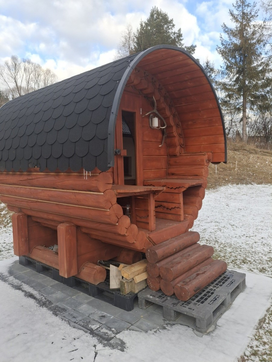 sauna na zewnątrz opalana drewnem