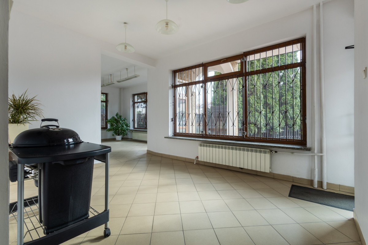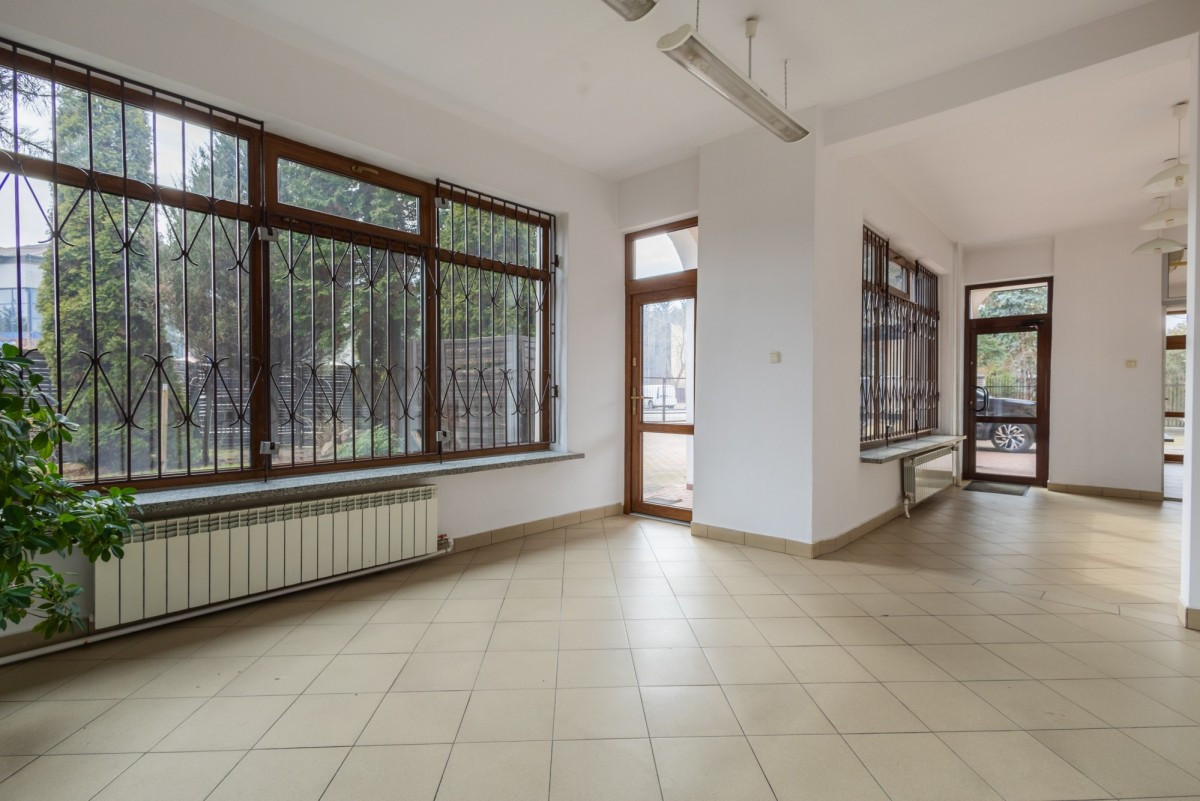 Na parterze znajduje się również zaplecze socjalno-magazynowe, dwie toalety, hol, kotłownia oraz garaż.